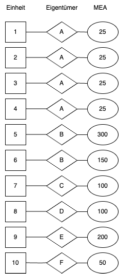 Hier muss bei der Stimmauswertung etwas mehr gerechnet werden. Obwohl Eigentümer A vier Einheiten besitzt, kommt er insgesamt auf ebenso viele Miteigentumsanteile wie Eigentümer C oder D für sich genommen- nämlich 100. Eigentümer E hat mit einer einzelnen Wohnung mit einer MEA von 200 sogar mehr Stimmanteile als Eigentümer A. Eigentümer B hält mit 450 Miteigentumsanteilen beinahe die Hälfte der Anteile, obwohl ihm nur zwei Einheiten gehören.