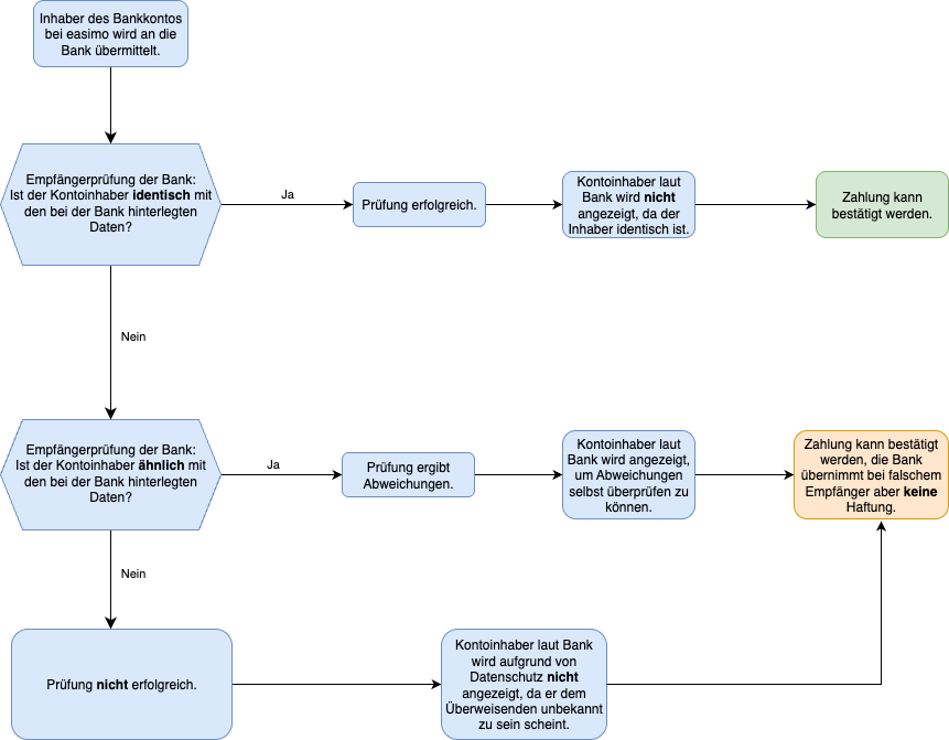 Ein Zahlungsauftrag, welcher keine erfolgreiche Empfängerüberprüfung durchlaufen hat, wird daher nicht von der Bank abgelehnt. Die Entscheidung, ob eine Überweisung ausgeführt wird, liegt immer bei der Person, die den Auftrag erteilt.